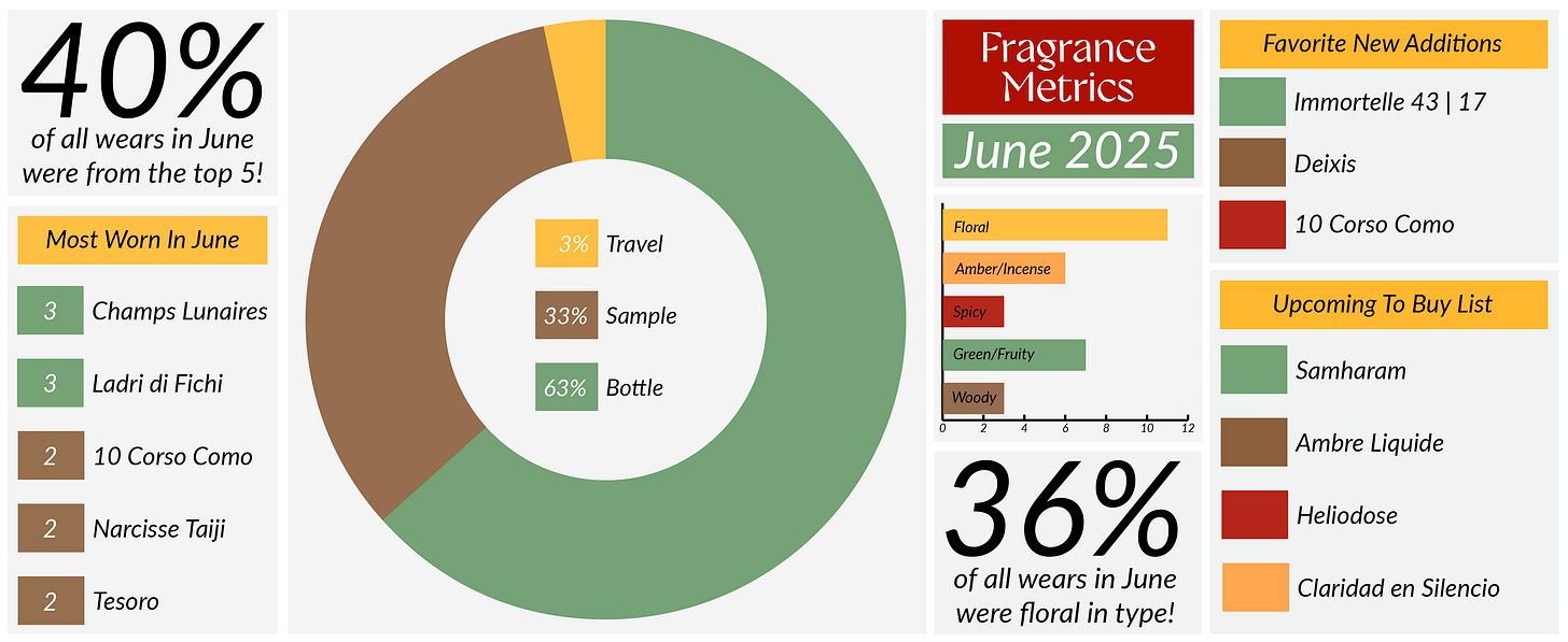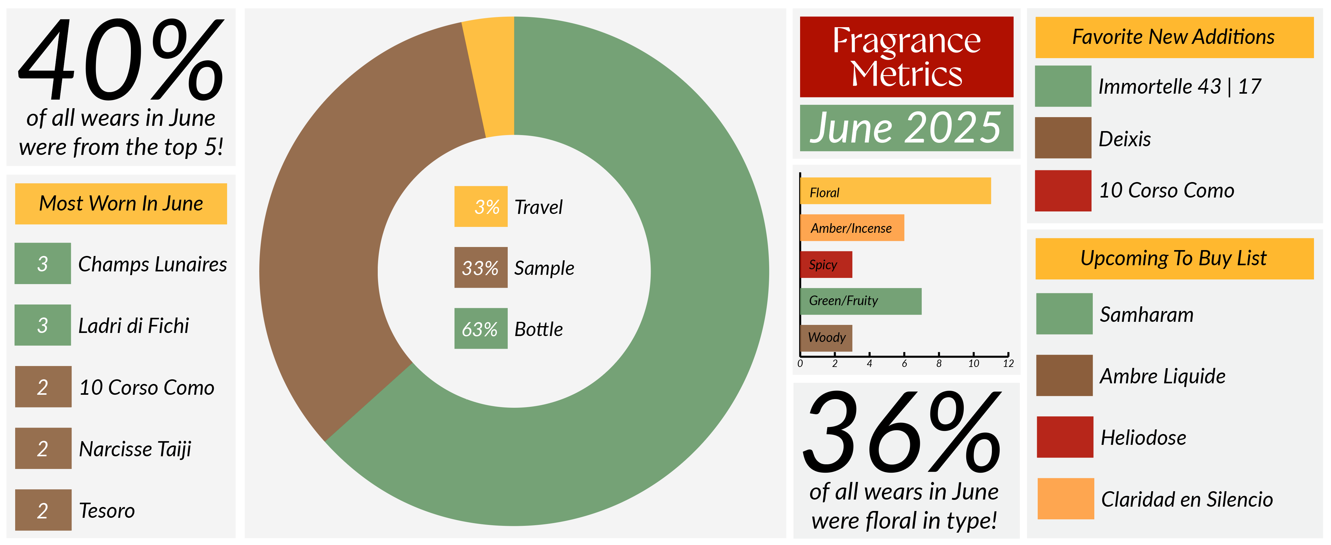 More than 1/3 of my wears in June were florals, with 3 of my top 5 most worn falling into this category. My ratio of wearing my FBs vs trying new things is right where I want it (2:1), so I was happy to see that. A few of the samples I wore this month I either purchased bottles of or intend to soon! I also decluttered 4 bottles in June, recycling back into new things that fit my evolved tastes.